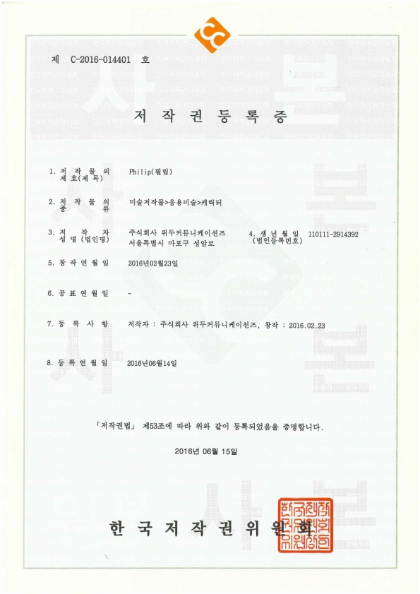 [한국/저작권] 필립 페이지 정보 작성자 WeDu 댓글 0건 조회 4,990회 작성일 19-05-30 19:09 본문 2016-06-14 저작권 C-2016-014401 필립 / 미술저작물>응용미술>캐릭터 List Previous[한국/저작권] 월터 19.05.30 Next[한국/저작권] 아리스 19.05.30