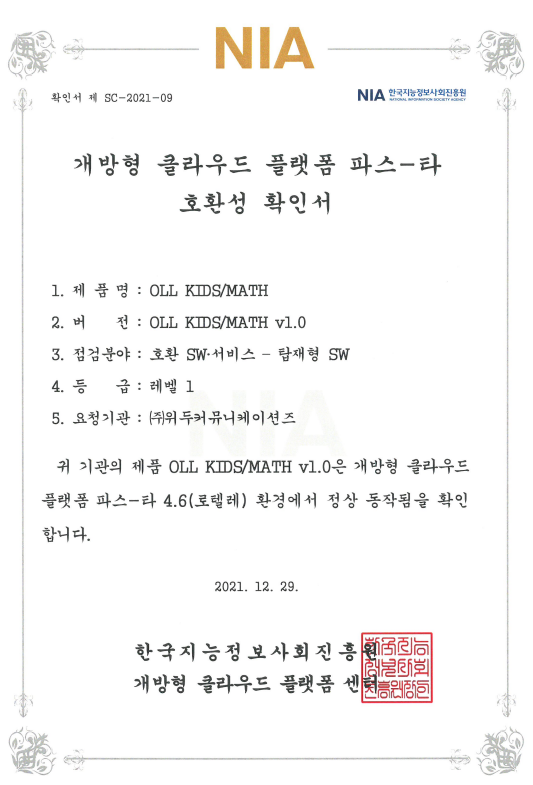 [한국/확인서] OLL KIDS/MATH 파스-타 호환성 확인서 페이지 정보 작성자 WeDu 댓글 0건 조회 8,465회 작성일 21-12-31 12:48 본문 2021-12-29 확인서 제 SC-2021-09 점검분야 : 호환 SW서비스 - 탑재형 SW List Next[한국/인증서] OLL KIDS/MATH 클라우드 서비스 확인서 21.12.31