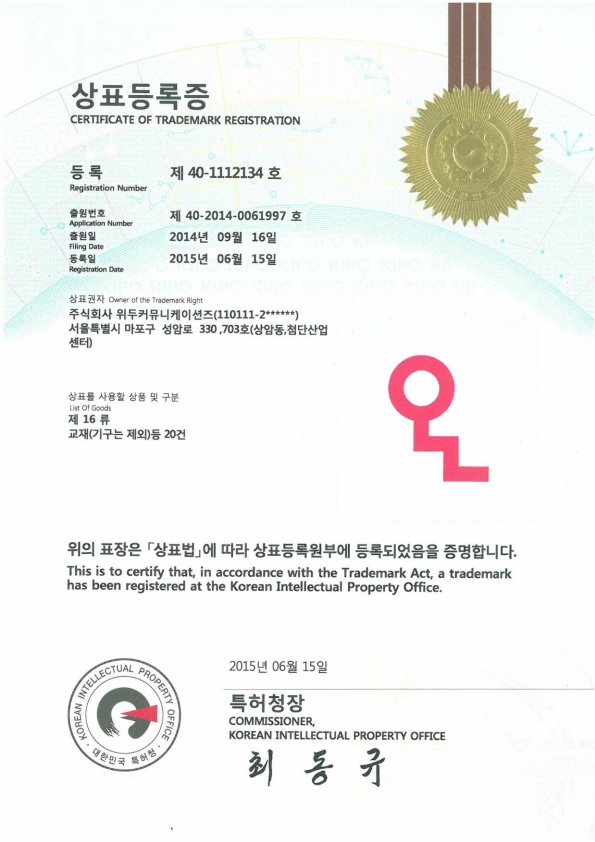 [한국/상표] OLL 16류 페이지 정보 작성자 WeDu 댓글 0건 조회 5,197회 작성일 19-05-30 18:59 본문 2015-06-15 상표 제 40-1112134호 16류 List Previous[한국/상표] OLL 41류 19.05.30 Next[한국/상표] OLL 09류 19.05.30